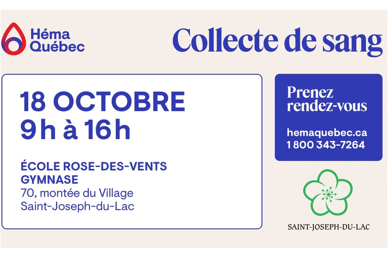 Le samedi 18 octobre prochain, une collecte de sang, organisée par Héma-Québec, aura lieu à l'école Rose-des-Vents, de 9 h à 16 h. Si vous souhaitez faire un don de sang, il suffit de s'y inscrire. Voici deux moyens pour ... En savoir plusPublié le jeudi 18 septembre 2025